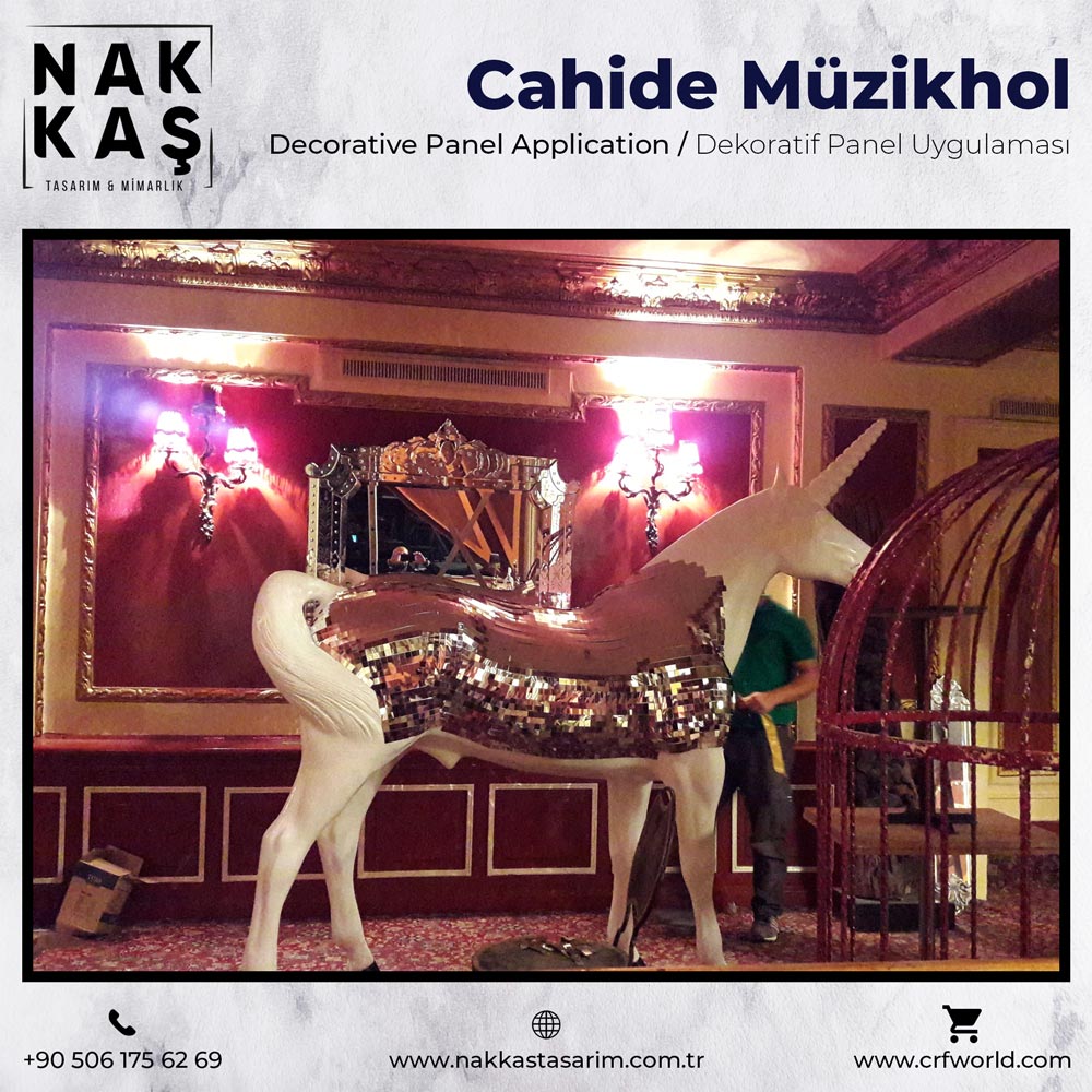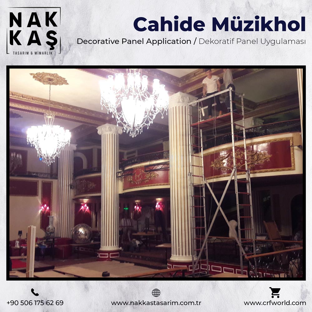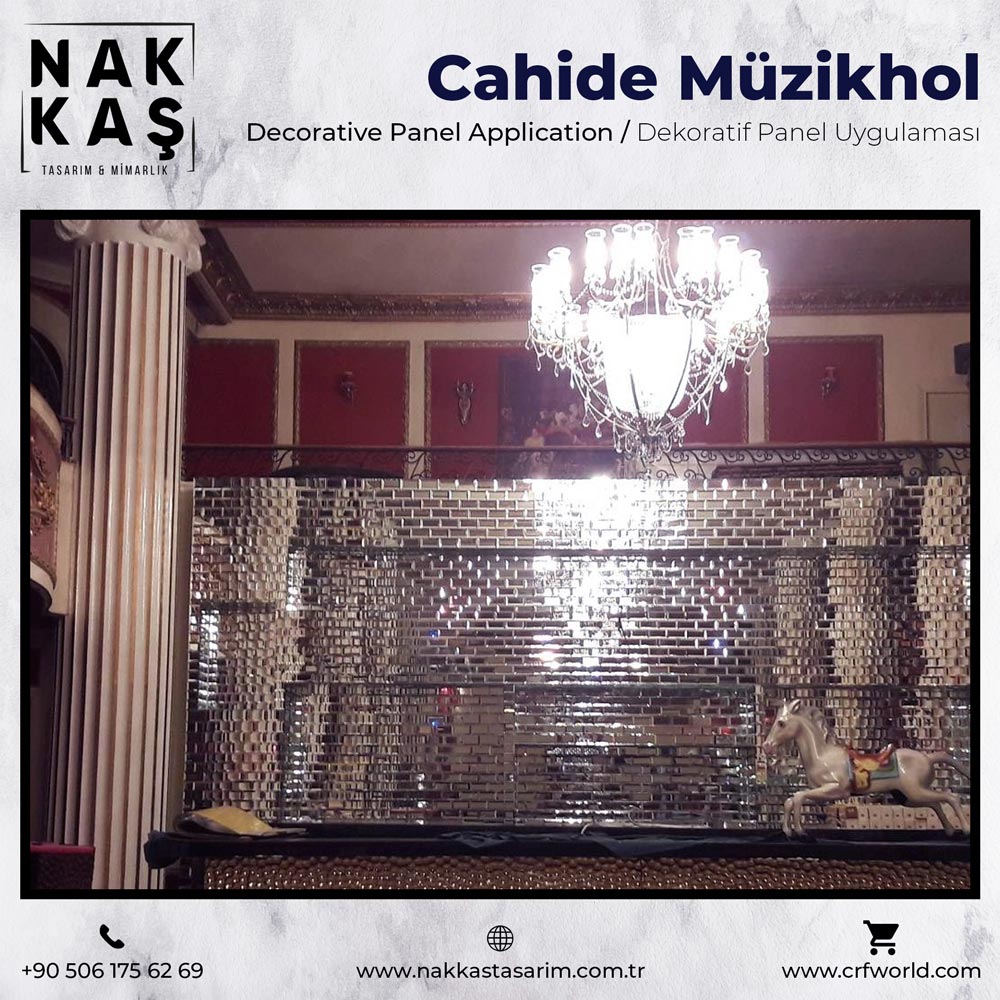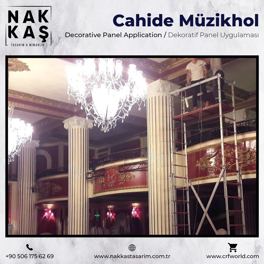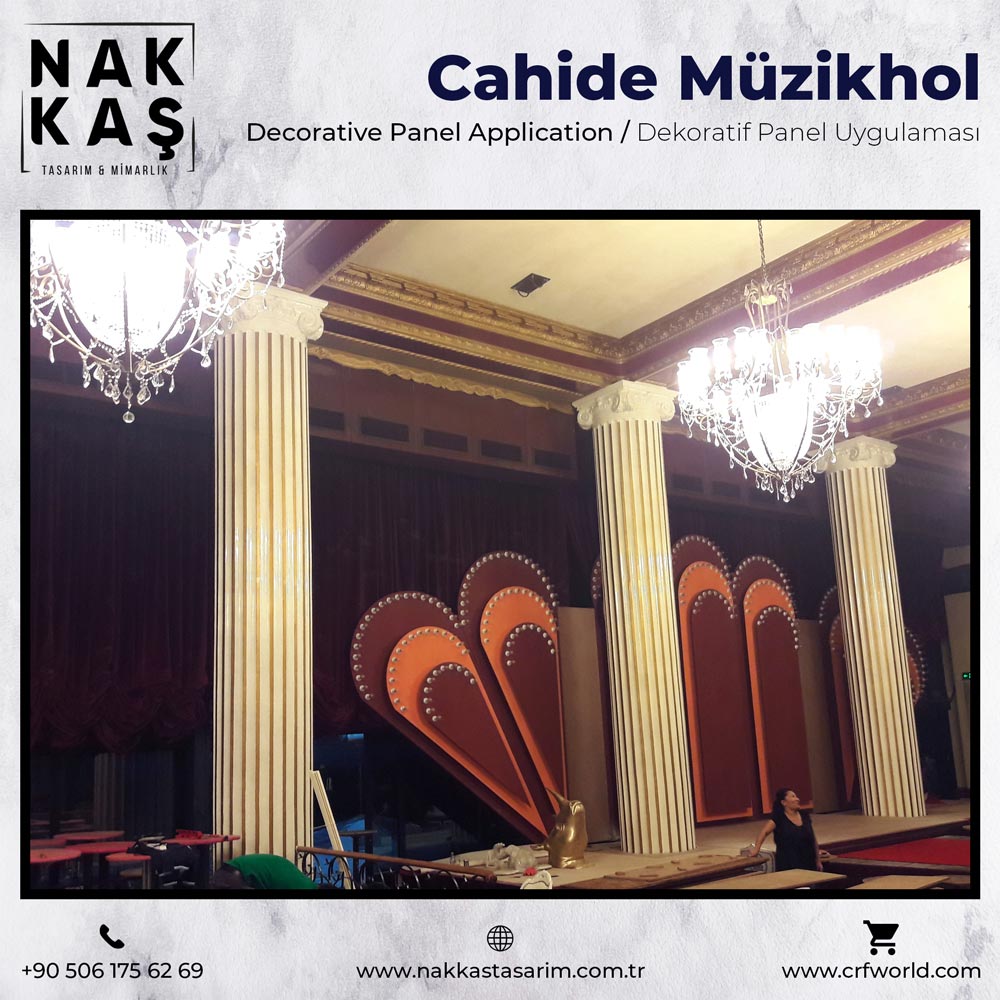 Cahide MüzikholOmer2023-05-23T21:57:55+03:00 You can view the images of the decorative panel application made by Nakkaş Tasarım of Cahide Müzikhol through the gallery below.